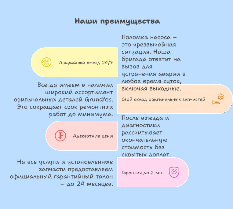 Всегда имеем в наличии широкий ассортимент оригинальных деталей Grundfos. Это сокращает срок ремонта до минимума.